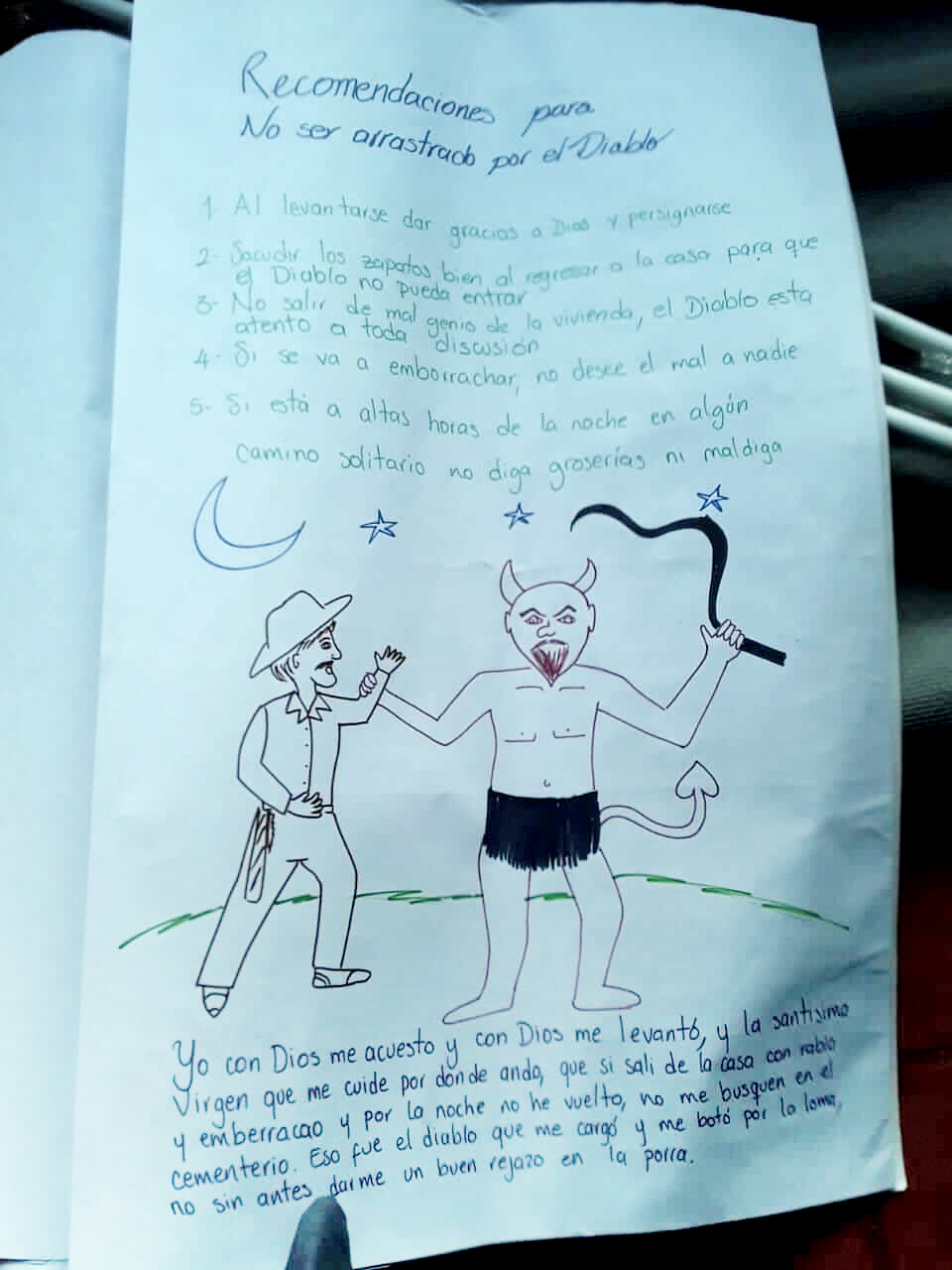 Yo con Dios me acuesto, y con Dios me levanto, y la santísima Virgen que me cuide por donde ando, que si salí de casa con rabia y emberracao y por la noche no he vuelto, no me busquen en el cementerio. Eso fue el diablo que me cargó y me botó por la loma no sin antes darme un buen rejazo en la porra.
