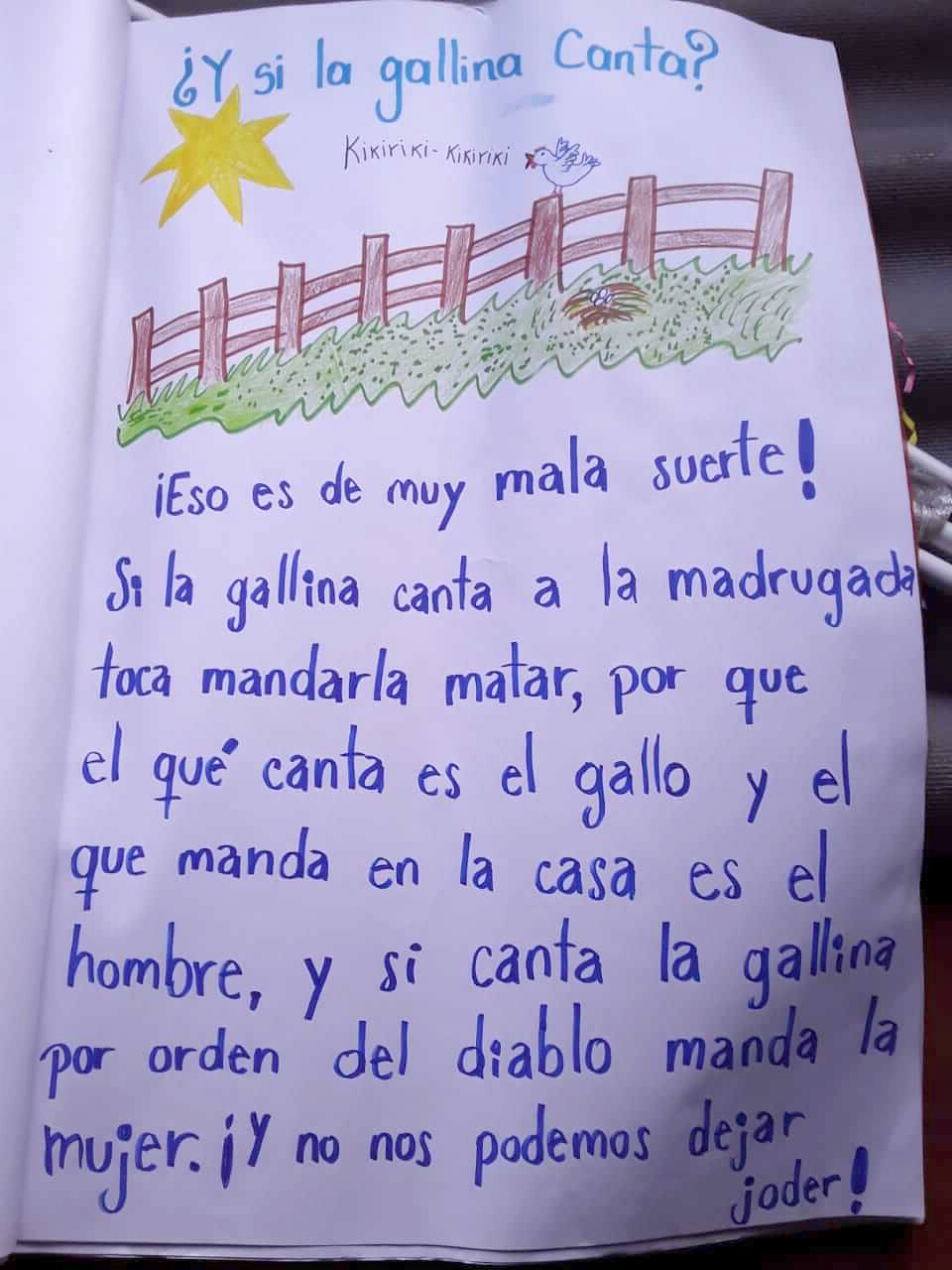 - Si la gallina canta a la madrugada toca mandarla matar, porque el que canta es el gallo y el que manda en la casa es el hombre, y si canta la gallina por orden del diablo manda la mujer. ¡Y no nos podemos dejar joder!