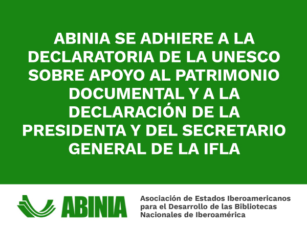 Teniendo en cuenta la necesidad de ampliar la cooperación nacional e internacional en la preservación y accesibilidad del patrimonio documental, la Asociación de Estados Iberoamericanos para el Desarrollo de las Bibliotecas Nacionales de Iberoamérica- ABINIA, se adhiere a esta declaratoria.