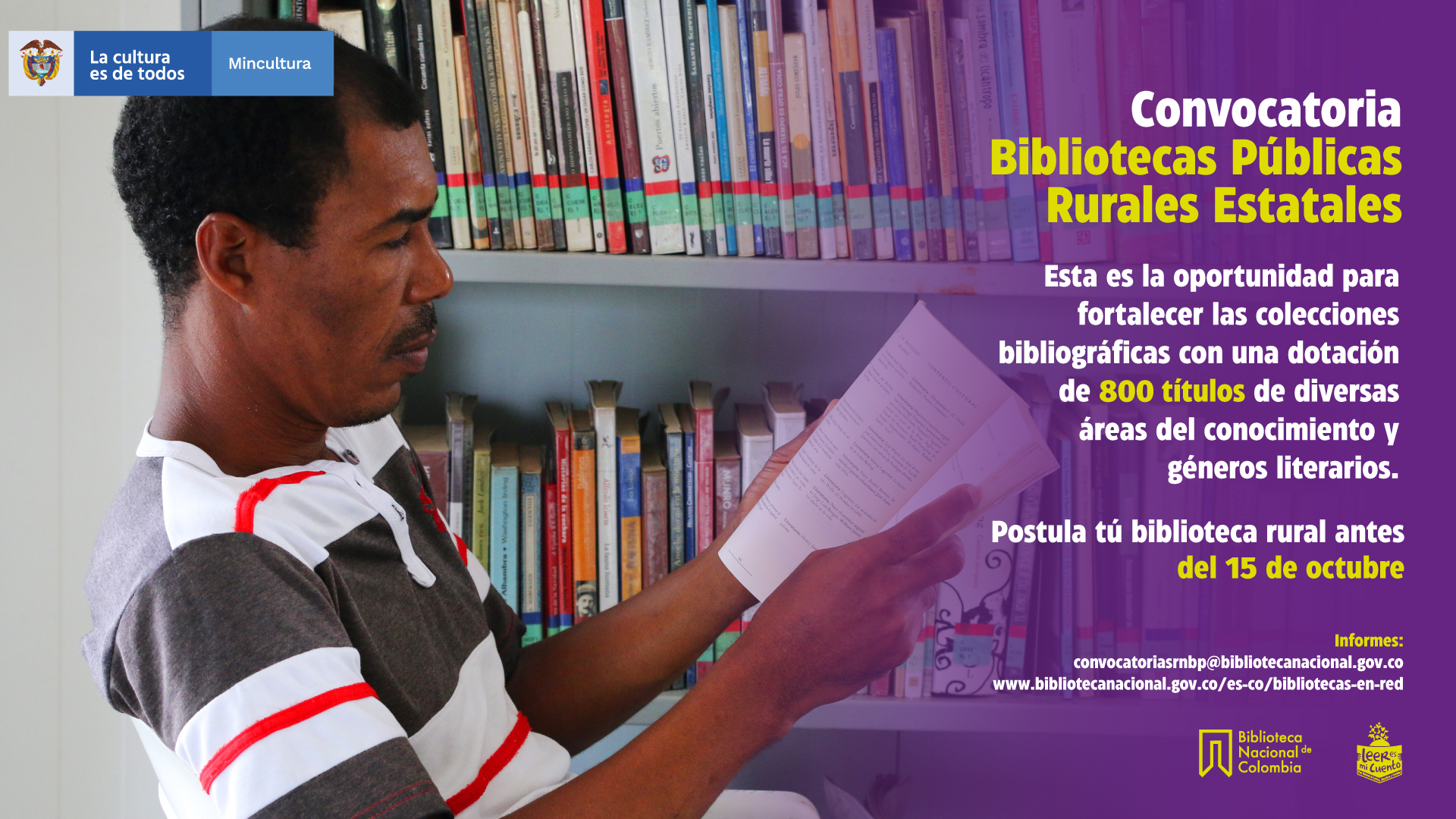 - El Ministerio de Cultura y la Biblioteca Nacional de Colombia (BNC) realizan la convocatoria para el fortalecimiento de las colecciones bibliográficas de las bibliotecas públicas rurales adscritas a la Red Nacional de Bibliotecas Públicas (RNBP).