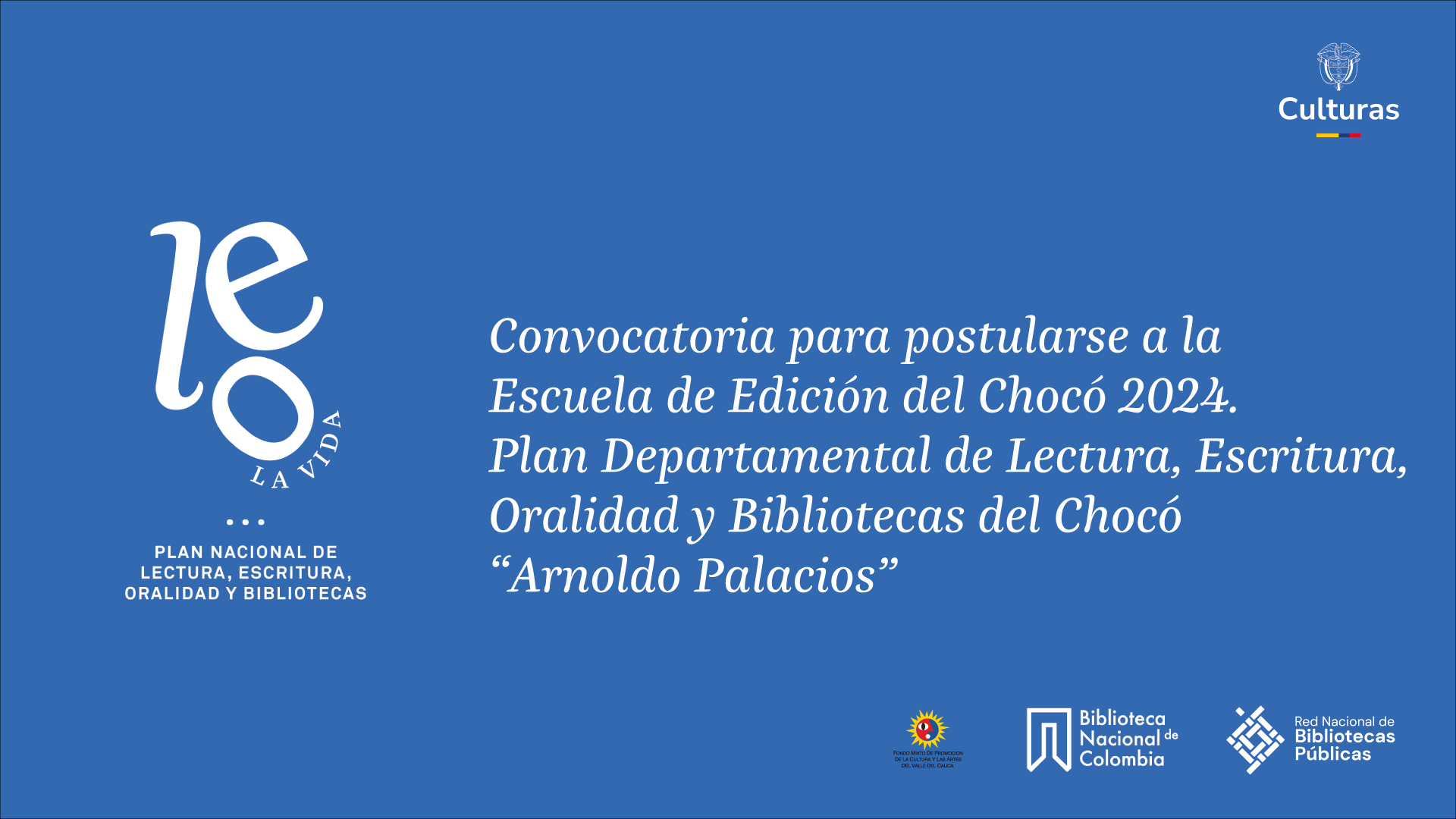 ​El Ministerio de las Culturas, las Artes y los Saberes, la Biblioteca Nacional de Colombia y la Cámara Colombiana de la Edición Independiente invitan a participar en la Escuela de Edición del Chocó 2024, en el marco del Plan Departamental de Lectura, Escritura, Oralidad y Bibliotecas del Chocó “Arnoldo Palacios” (PDLEOB-Chocó).