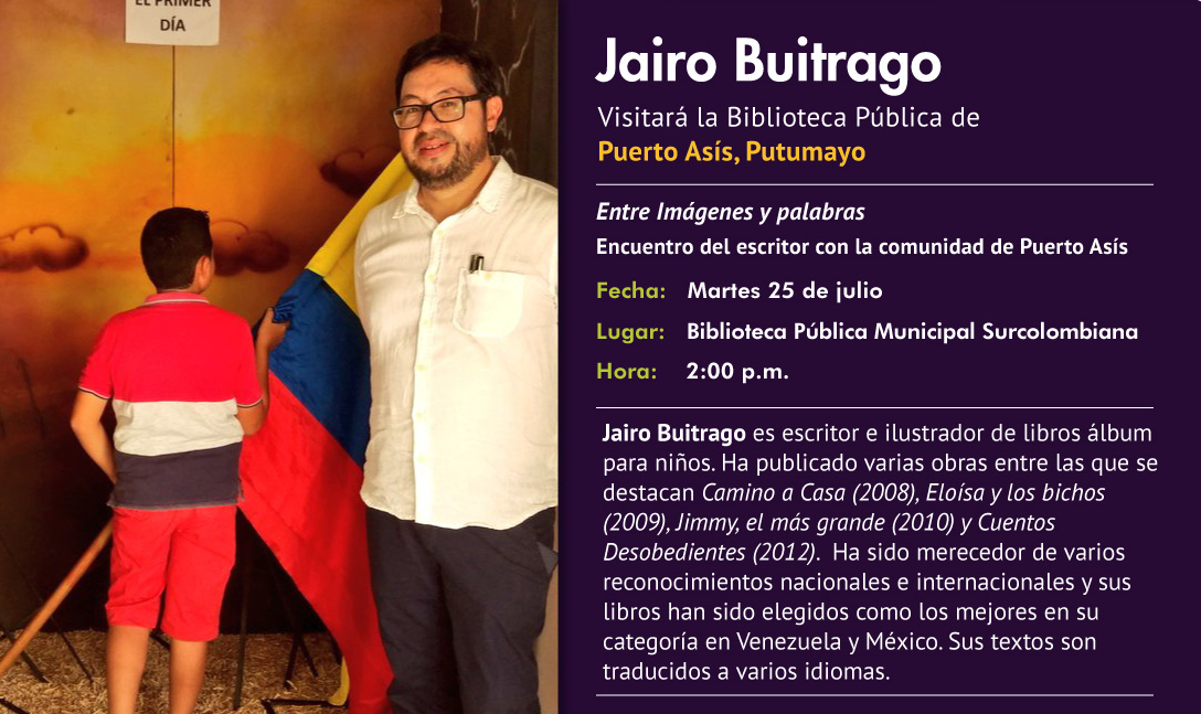 Bogotá, julio 21 de 2017. En el marco del programa "Escritores en las bibliotecas", Jairo Buitrago participará en un encuentro con los niños, jóvenes y adultos de los municipios de Puerto Asís y Mocoa, para compartir con ellos su experiencia como lector y escritor y de esta manera motivarlos a que conozcan, lean y disfruten más de la literatura colombiana.