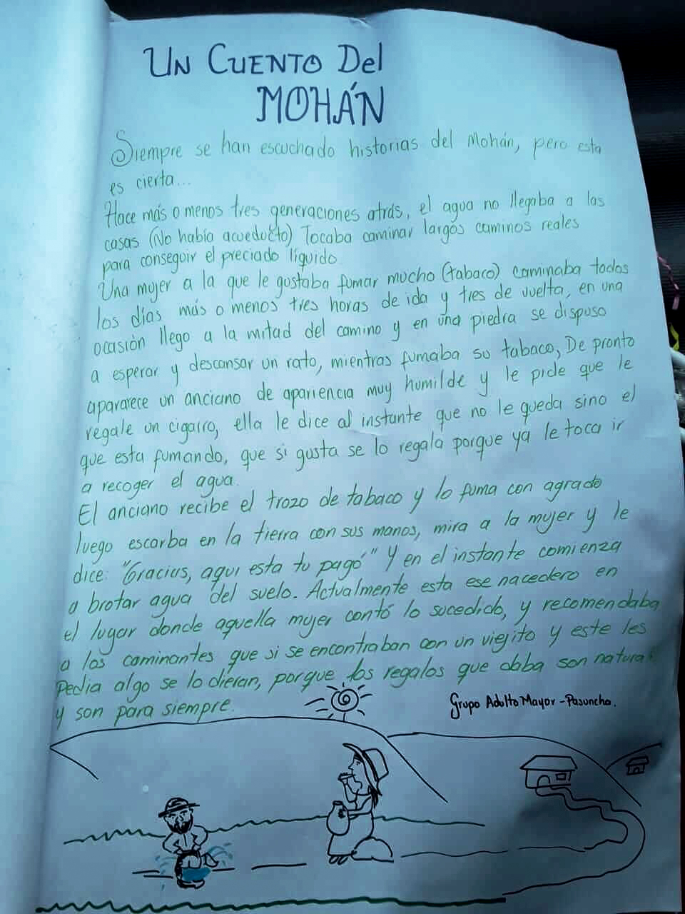 Siempre se han escuchado historias del Mohán, pero esta es cierta. Hace más o menos tres generaciones atrás, el agua no llegaba a las casas (no había acueducto). Tocaba caminar largos caminos reales para conseguir el preciado líquido. Una mujer a la que le gustaba fumar mucho (tabaco) caminaba todos los días más o menos tres horas de ida y tres de vuelta. En una ocasión llegó a la mitad del camino y en una piedra se dispuso a esperar y descansar un rato, mientras fumaba su tabaco, de pronto aparece un anciano de apariencia muy humilde y le pide que le regale un cigarro, ella le dice al instante que no le queda sino el que está fumando, que si gusta se lo regala porque ya le toca ir a recoger agua. El anciano recibe el trozo de tabaco y lo fuma con agrado, luego escarba en la tierra con sus manos, mira a la mujer y le dice: "Gracias, aquí está tu pago", y en el instante comienza a brotar agua del suelo. Actualmente está ese nacedero en el lugar donde aquella mujer contó lo sucedido, y se recomienda a los caminantes que, si se encuentran con el viejito y este les pide algo, se lo den, porque los regalos que da son naturales y para siempre.