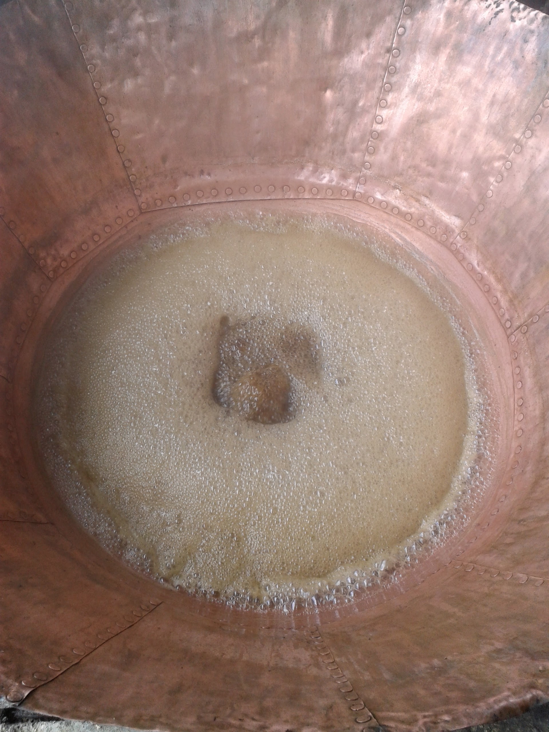 Después de estar el melado, que mantiene la atención de los trabajadores mientras se cocina porque se debe agitar constantemente, se pasa a la artesa, donde se sigue agitando para ser engaberado (el momento del enfriamiento y molde).