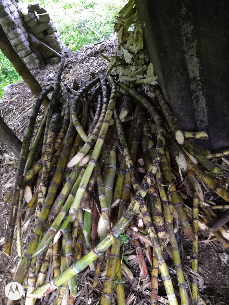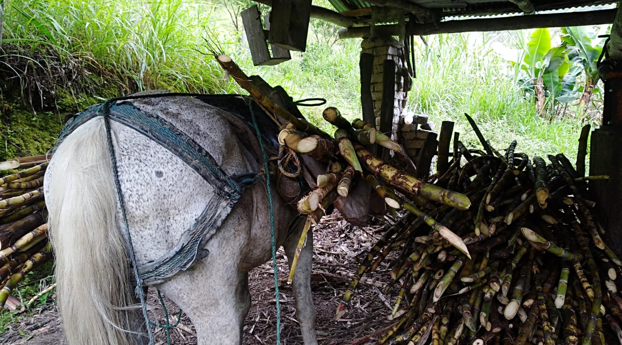 El proceso empieza con el corte y el transporte de la caña que va a ser pasada por el trapiche. Aquí podemos ver el trapiche con motor que se usa para hacerlo aún más rápido.