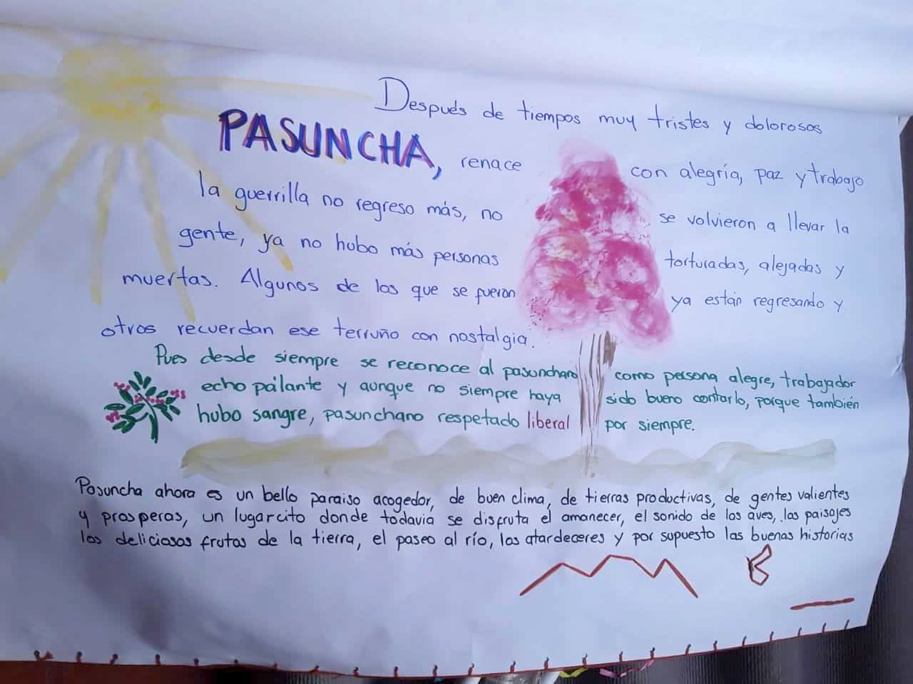 Después de tiempos muy tristes y dolorosos, Pasuncha renace con alegría, paz y trabajo. La guerrilla no regresó más, no se volvieron a llevar la gente, no hubo más personas torturadas, desplazadas, ni muertas. Algunos de los que se fueron ya están regresando y otros recuerdan este terruño con nostalgia.
